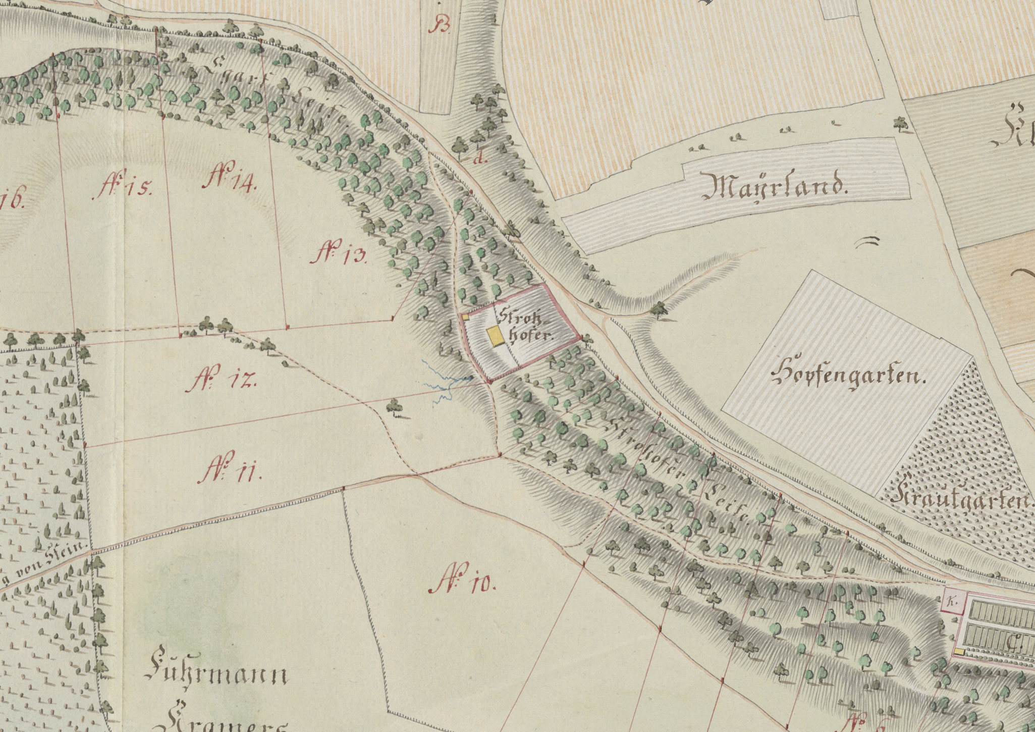 Der ursprüngliche Standort vom Strohhof ist auf einer Karte aus der Zeit von 1803 (im linken oberen Bereich des Ausschnitts) zu erkennen. Die gesamte Karte ist im heutigen Heimatmuseum in Altenmarkt ausgestellt. Rechts unterhalb vom damaligen Standort befindet sich auf der Karte ein Schriftzug mit der damaligen Benennung des Hangabschnitts "Strohhofer Leite", der sich in Richtung zum Kloster Baumburg erstreckt. Heute wird dieser Hang als "Baumburger Leite" bezeichnet.